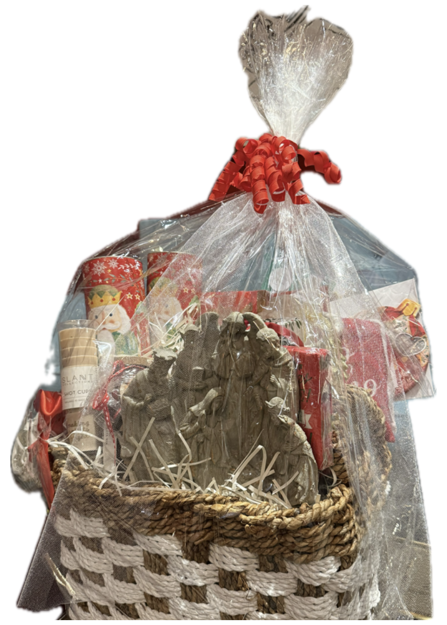 Nativity Scene, Christmas Napkins and Candles, Santa Mugs, Hot Cocoa Mix, Cookies, Christmas Book, Hand Towels, Apron, Paper Plates, and Shot Glasses