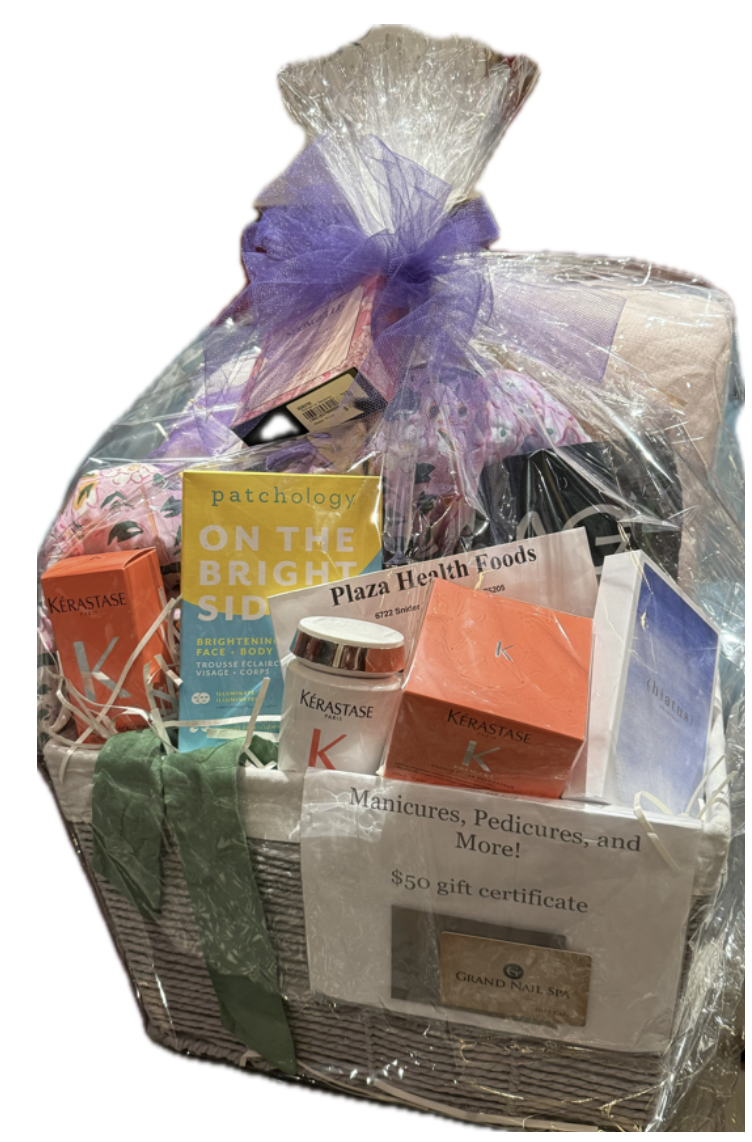 Hiatus Spa $200 Gift Card, $100 Mani/Pedi Gift Card, Mere Salon - Gift Card for Haircut, Kerastase Hair Products, Plaza Health Foods Woman's Vitamins and $100 Gift Card, 5 Personal Training Sessions at NexGen Fitness, Pink Matouk Throw, Satin Eye Mask, Face/Eye/Foot Masks, Athletic Greens, Hydration Running Belt, and One Hundred Stars Robe